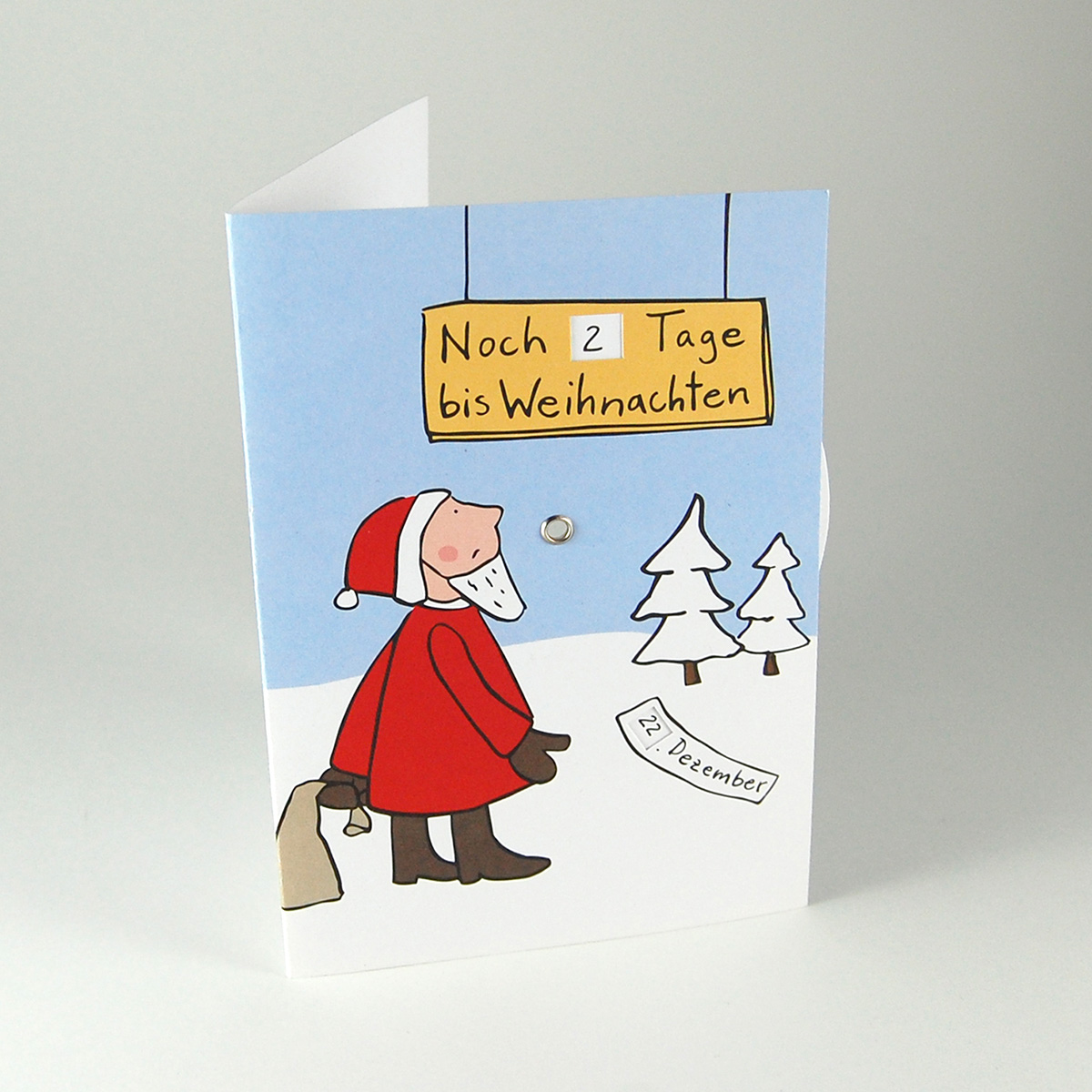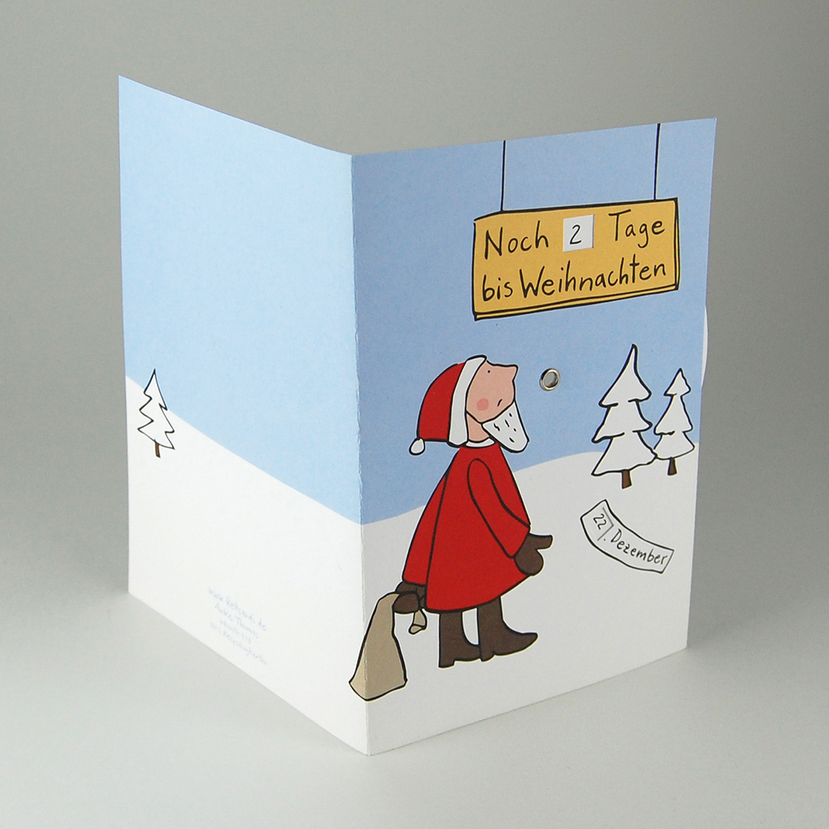 Die Karte ist ein Adventskalender und funktioniert wie eine Parkuhr: jeden Tag ein bißchen weiterdrehen. Im unteren Feld wird das Datum angezeigt, im oberen die Tage bis Weihnachten gezählt ...