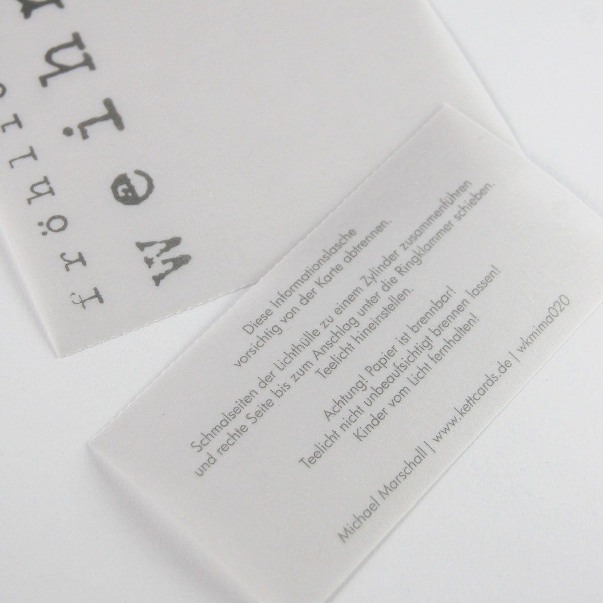 Weihnachtsgrüße aus Transparentkarton: wir liefern die Karten flach, Sie verschicken sie ebenso. Der Empfänger kann die Karte dann rollen und als stimmungsvolle Hülle für ein Teelicht verwenden.