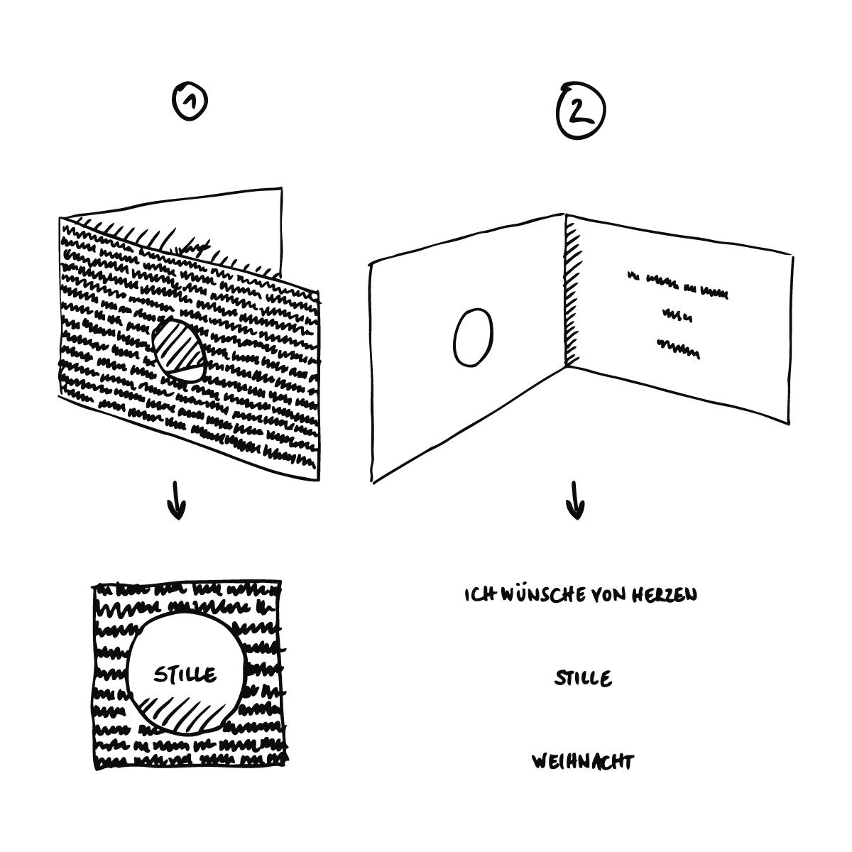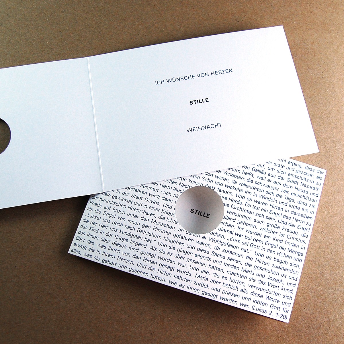 Durch den ausgestanzten Kreis auf der vorderen Klappe erkennt man das Wort STILLE, das im Inneren der Karte gedruckt ist, wenn man die Karte aufklappt liest man dann: „Ich wünsche von Herzen Stille Weihnacht“.