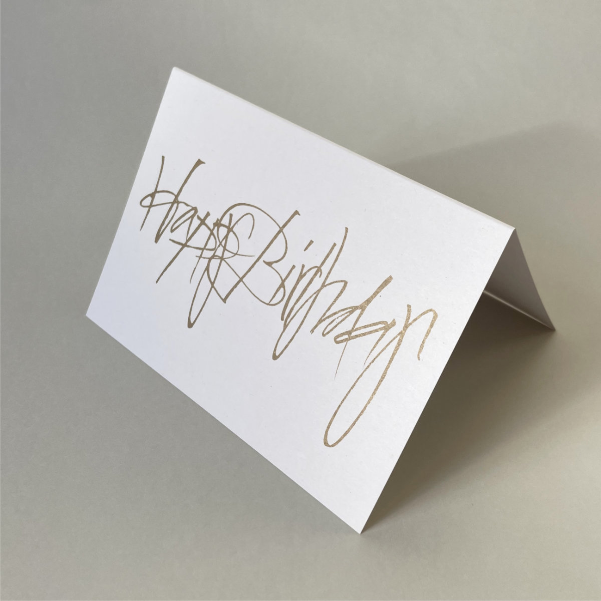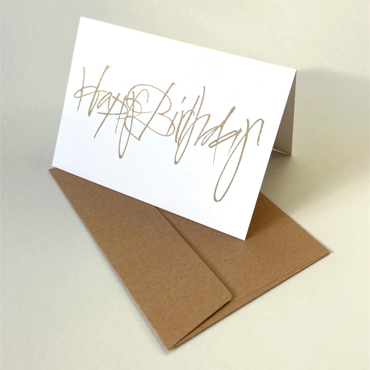 Recycling-Geburtstagskarte mit goldenem Schriftzug „Happy Birthday“ und einem braunem Recyclingumschlag.