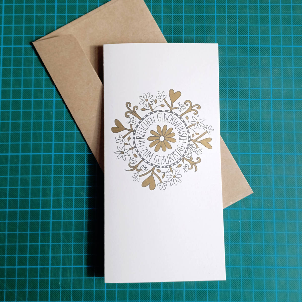 Herzlichen Glückwunsch zum Geburtstag - Handlettering mit Herzen, Blumen und Schrift - schwarzer und bronze-goldener Druck auf weißem Recyclingkarton.