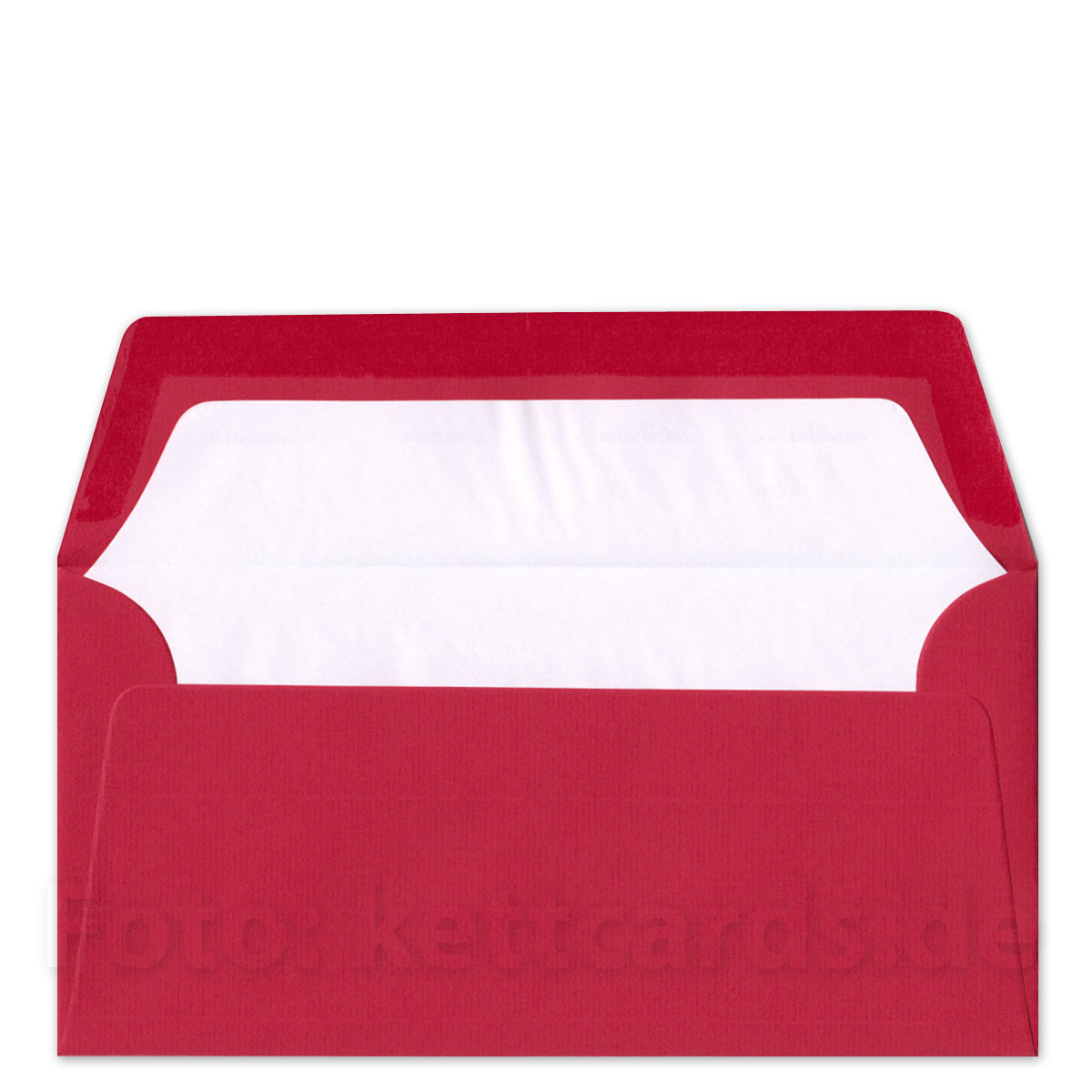 - gefütterter Briefumschlag DL, breite Klappe nassklebend, rotes Papier 100 g/qm (die Farbe ist etwas heller als HKS 17 und etwas leuchtender als Pantone 187U) + naturweißes Seidenfutter