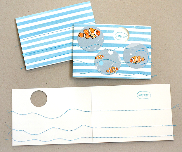 - Klappkarte: Querformat DIN A6 (offen 10,5 x 29,6 cm) - cremeweißer Karton - Collage mit Naht und gestanztem Loch