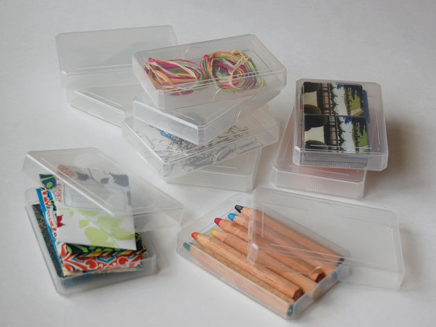 Das Foto zeigt Beispiele, was in die Schachtel alles passt (außer selbst gebastelten Kartenspielen): Visitenkarten, Schießgummis, Büroklammern, kleine Stifte ...