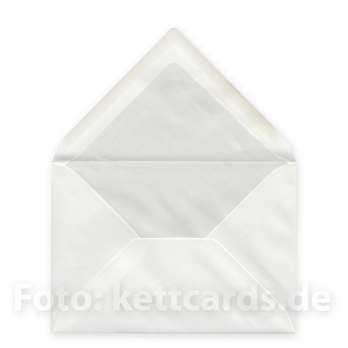 - gefütterter Umschlag DIN C6 (11,4 x 16,1 cm) - spitze Klappe nassklebend - Material: naturweißes Papier 90 g/qm + hellgraues Seidenfutter - Gewicht: knapp 5 Gramm