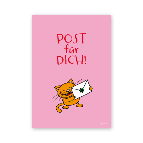 Bunte Postkarte mit Spruch, Katze, Brief und Kleeblatt