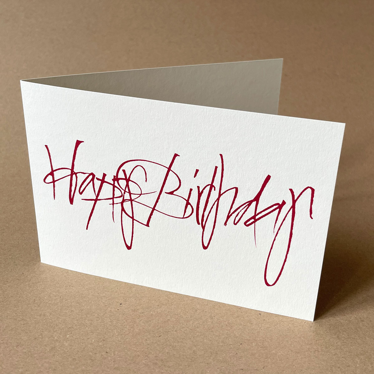 Glückwunschkarten mit eleganter und sehr freier Kalligrafie „Happy Birthday“. Ein persönlicher Glückwunsch in Künstlerhandschrift schwungvoll kalligrafiert.Kräftiger roter Druck auf Recyclingmaterial.