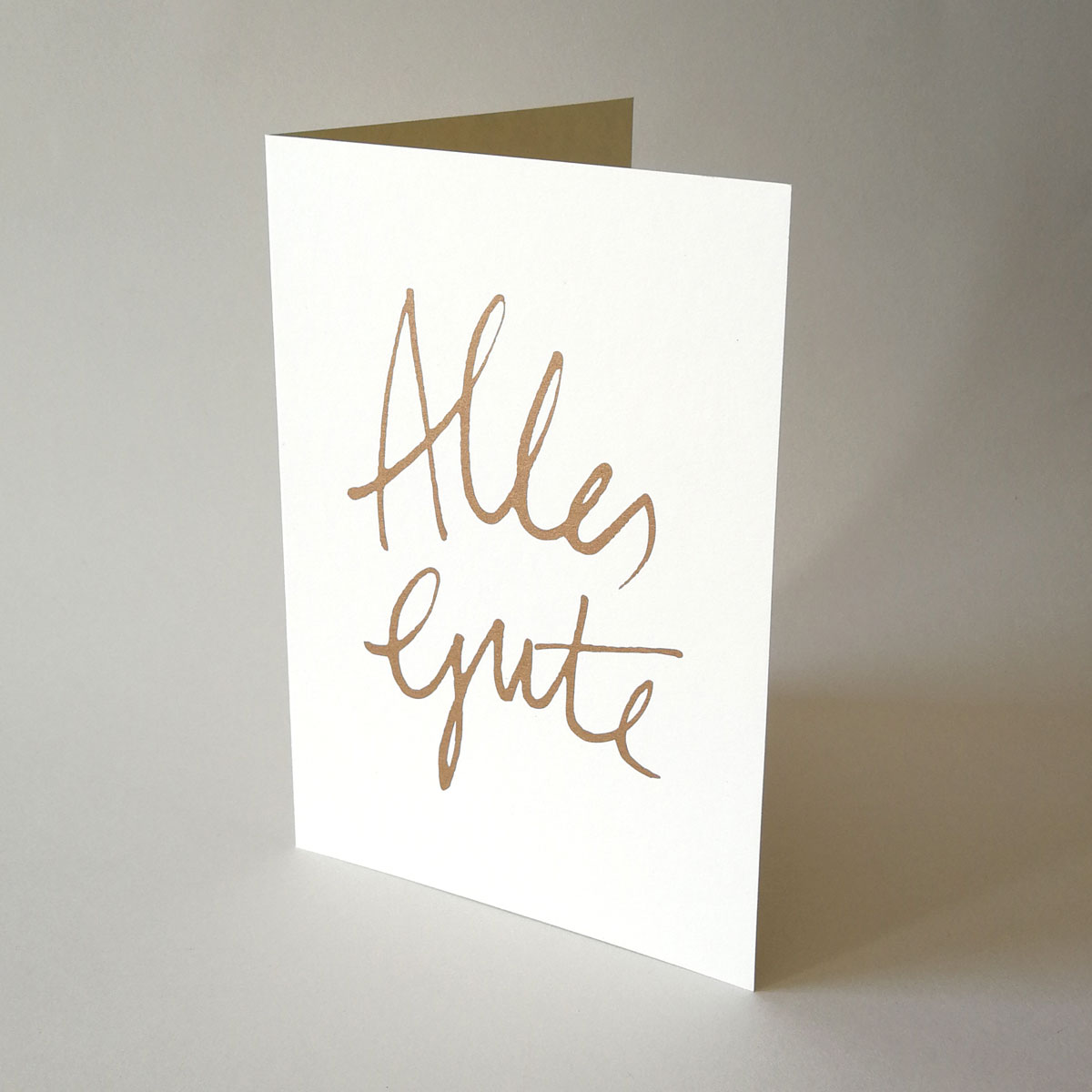 Gold gedruckter, schwungvoller Schriftzug auf cremeweißem Recyclingkarton. Schöne Karten für Glückwünsche zum Geburtstag, zu Kommunion und Konfirmation oder Jugendweihe, einen neuen Lebensabschnitt oder für ein Hochzeitspaar.