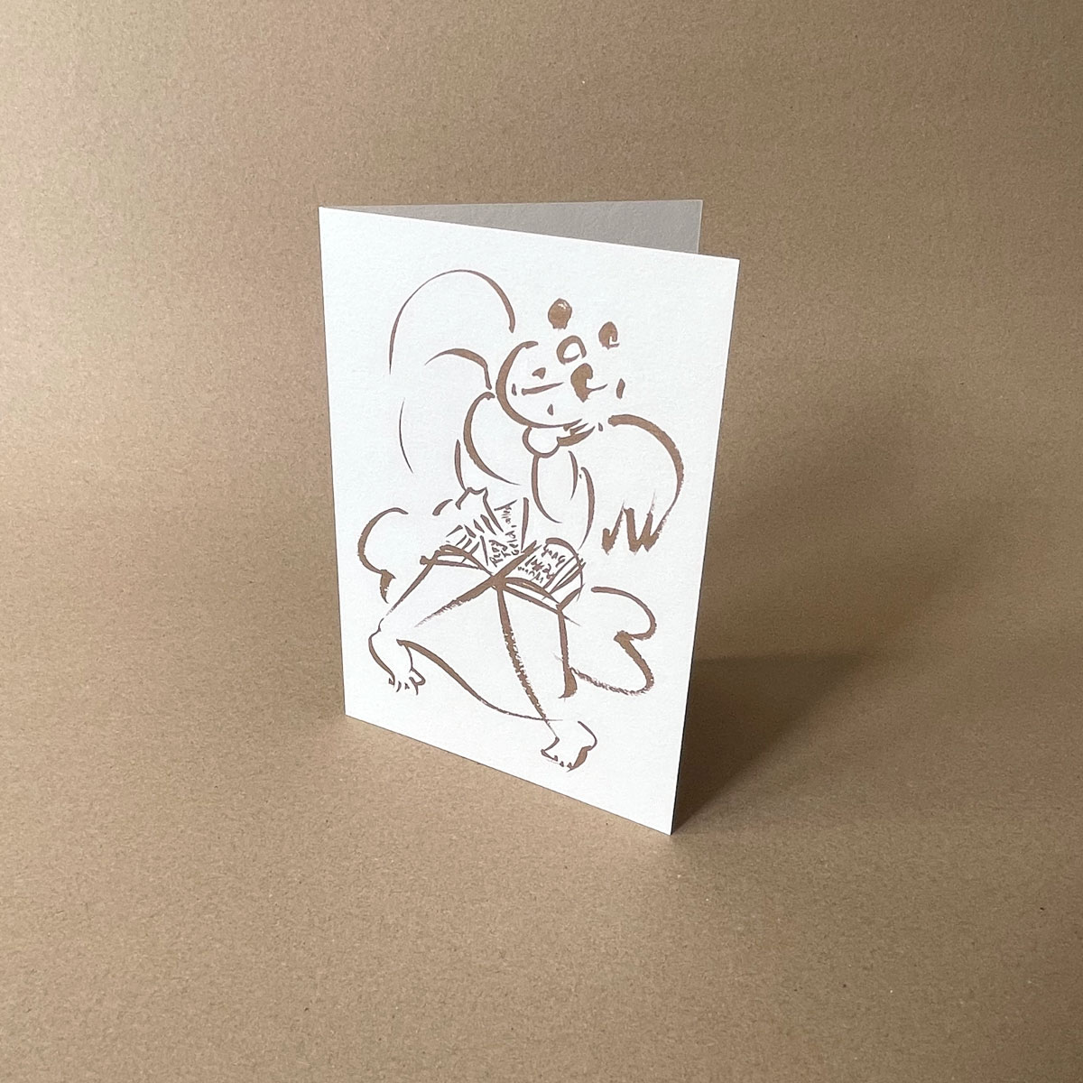 Gold gedruckter, schwungvoller Engel auf cremeweißem Recyclingkarton.