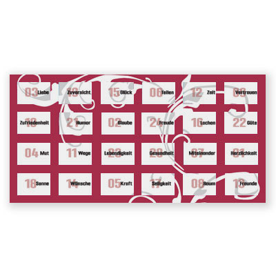 Hinter den Türchen stehen einzelne Worte wie Liebe, Glück, Zuversicht, Teilen ...