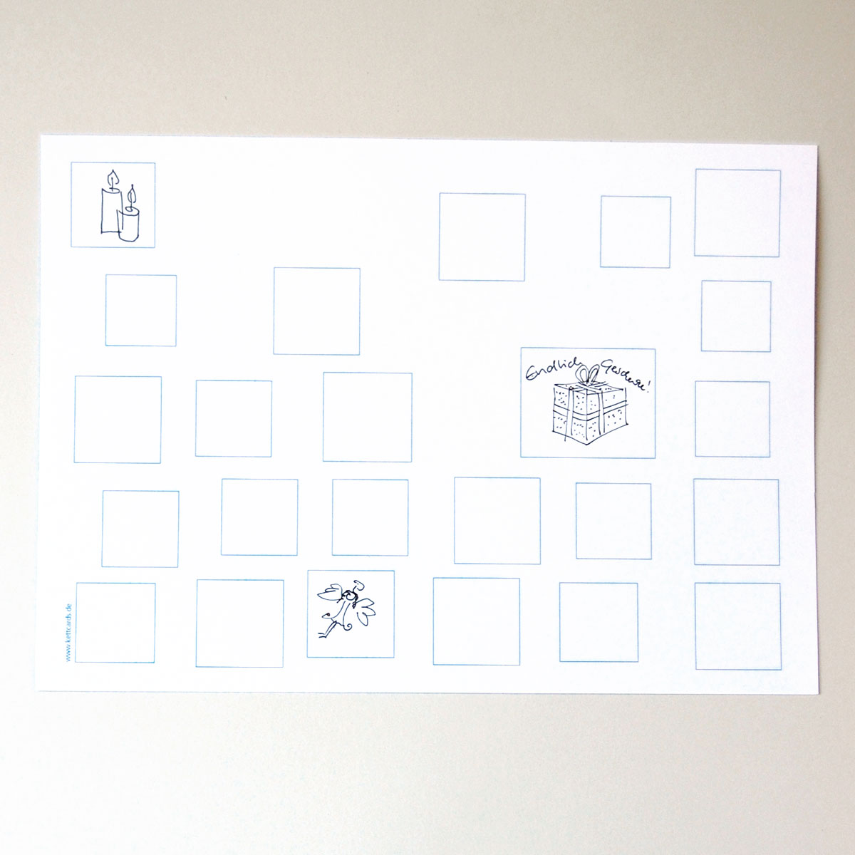 Diesen Bogen empfehlen wir, wenn Sie einen Adventskalender per Hand gestalten wollen. Dann müssen Sie sich dank der Linien um die Felder keine Gedanken machen, wo sie Ihre Bilder der Innenseite des Kalenders platzieren. Das Material lässt sich gut beschreiben und bemalen.