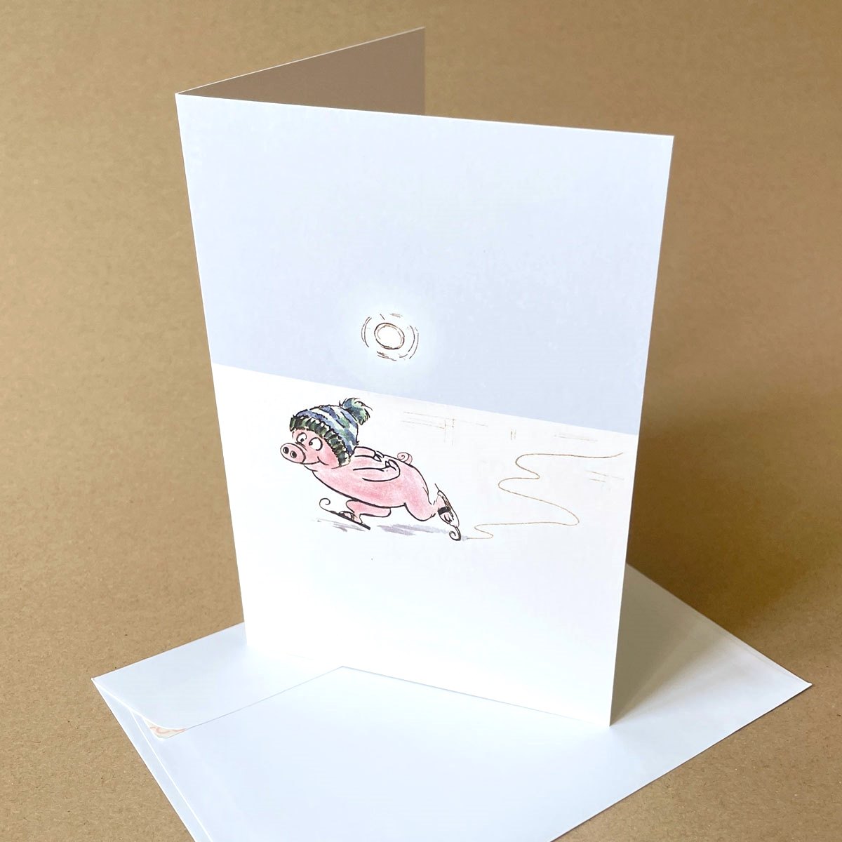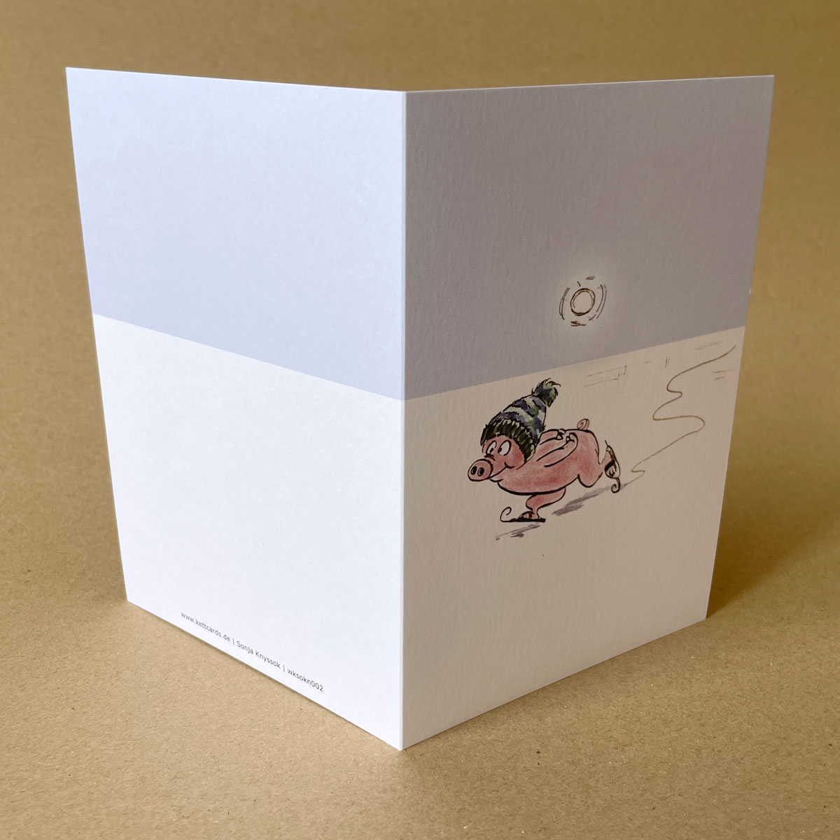 Winterfreuden - allein auf weiter Flur - ein Glücksschwein mit dicker Wollmütze beim Schlittschuhlaufen.