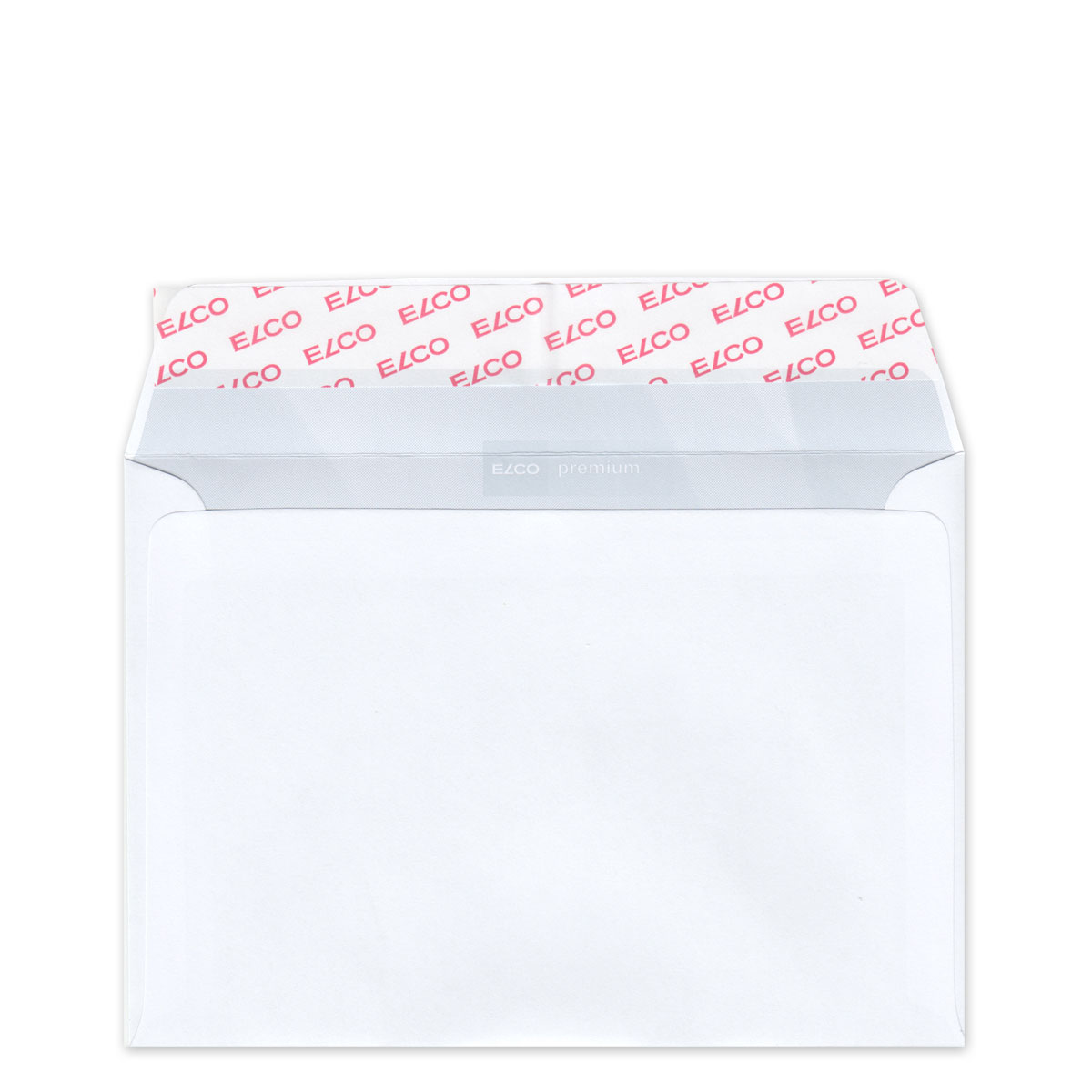 - weißer Umschlag 12,5 x 17,6 cm, gerade Klappe haftklebend (Papier 100 g/qm mit grauem Innendruck, Elco premium)