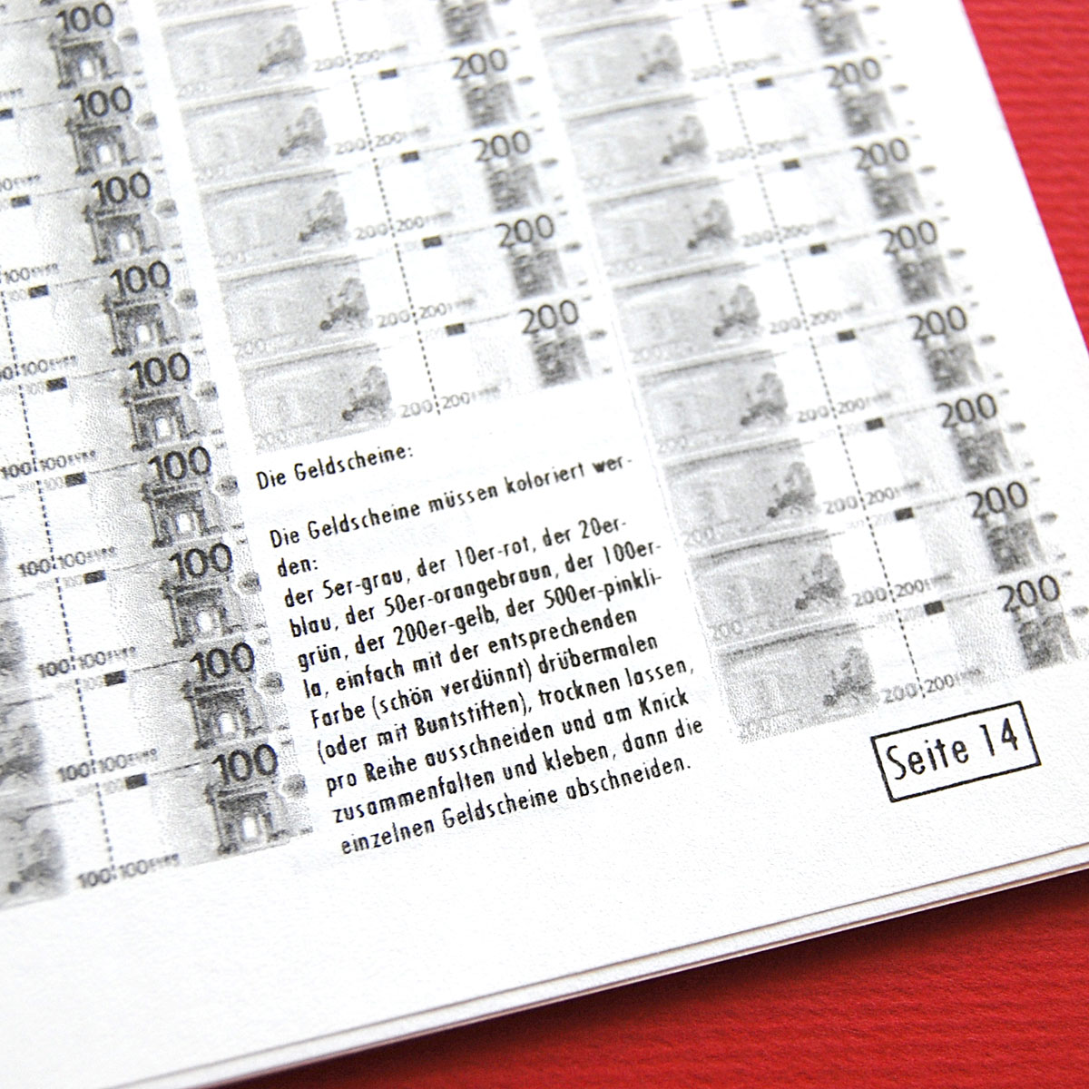 Eine komplette Bank zum Selberbasteln: mit Geldautomaten, Kontoauszugsdrucker, Bankräuber, Toilette, Angestellten, einem Azubi, Geldtransporter, Kunstwerken zum Selbermalen und jeder Menge Euros ...
