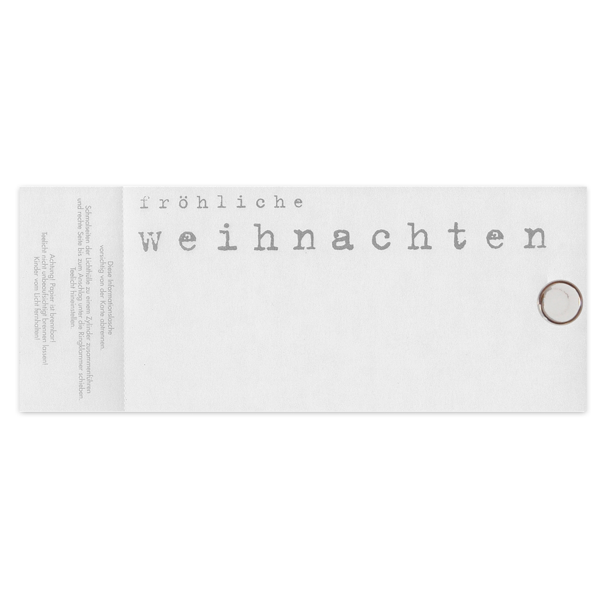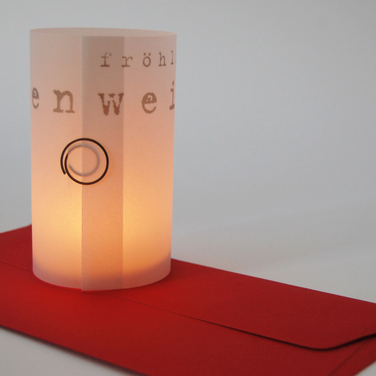 Weihnachtsgrüße aus Transparentkarton: wir liefern die Karten flach, Sie verschicken sie ebenso. Der Empfänger kann die Karte dann rollen und als stimmungsvolle Hülle für ein Teelicht verwenden.