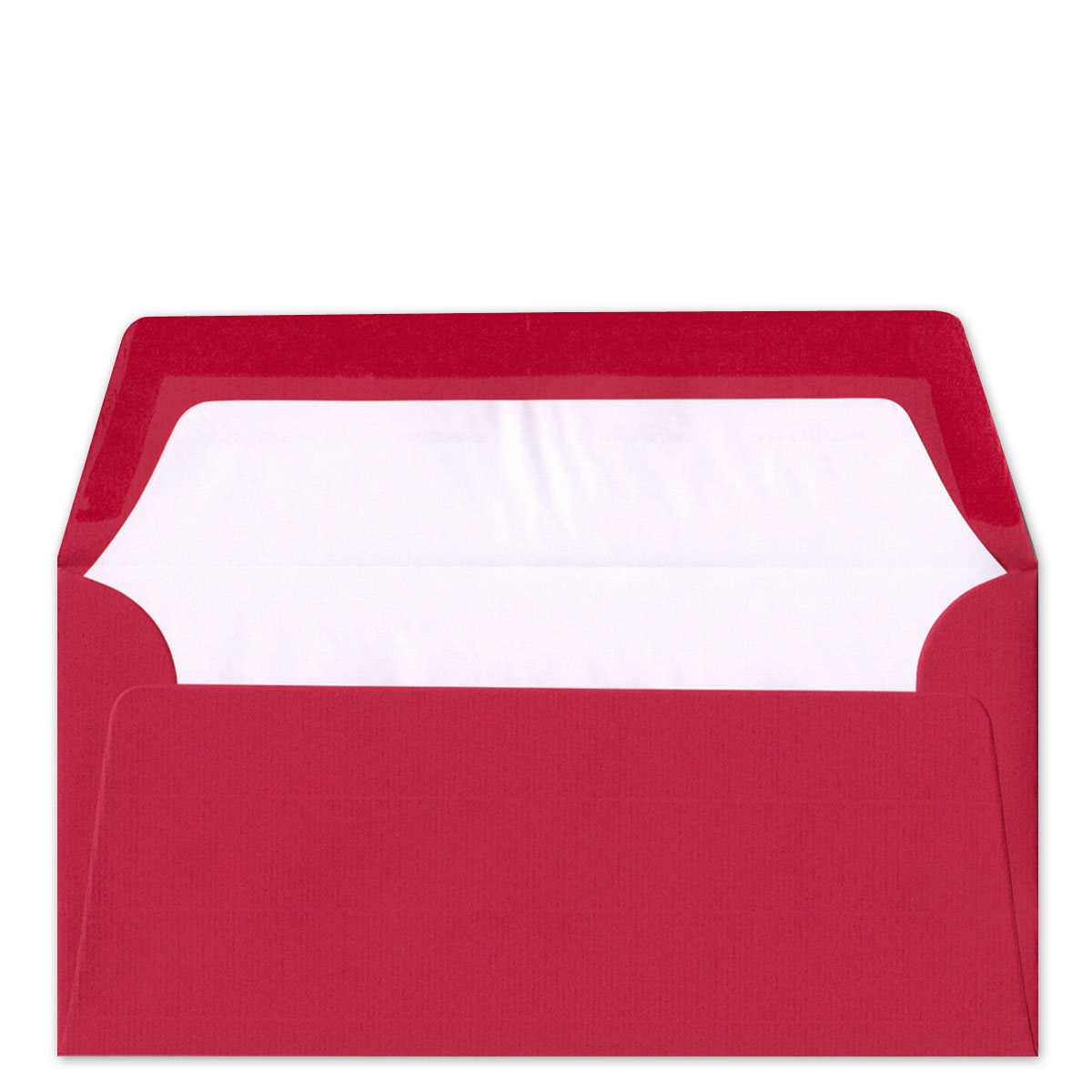 - gefütterter, roter Umschlag DL, weiß gefüttert, breite Klappe nassklebend, rotes Papier 100 g/qm (die Farbe ist etwas heller als HKS 17 und etwas leuchtender als Pantone 187U) + naturweißes Seidenfutter