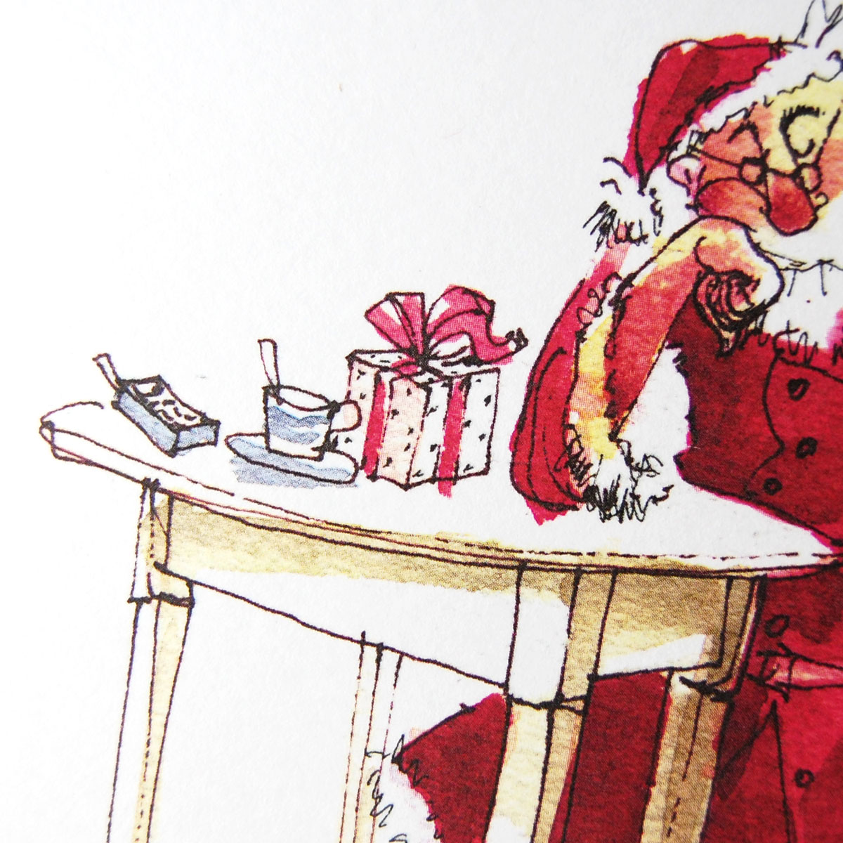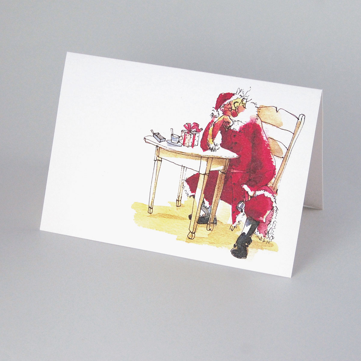 Endlich Pause! - Oder denkt er nach? Melancholia?Weihnachtskarten, klasse gezeichnet von Jokin Michelena. Der Weihnachtsmann versucht sich mit einem Espresso wach zu halten.