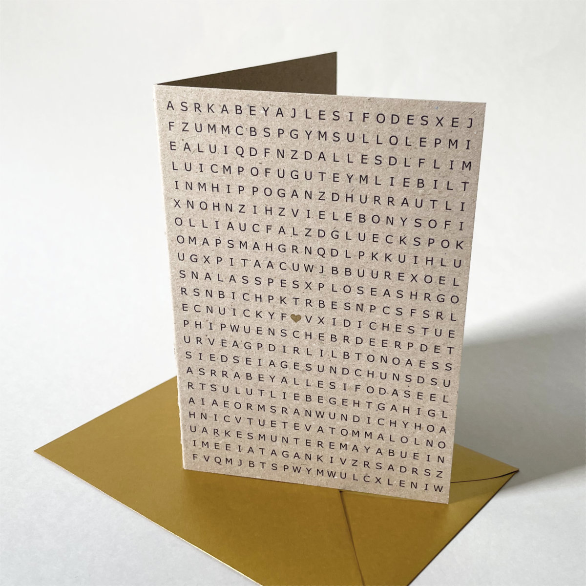 Die Buchstaben sind schwarz gedruckt, nur das Herz in der Mitte ist gold. Der Absender kann allerlei Wünsche heraussuchen und umranden: Ich wünsche Dir alles Gute - Lass es krachen - Gesund und Munter - Bleib Gesund - Bon Anniversaire - Happy Birthday - Hurra - ich liebe dich ...